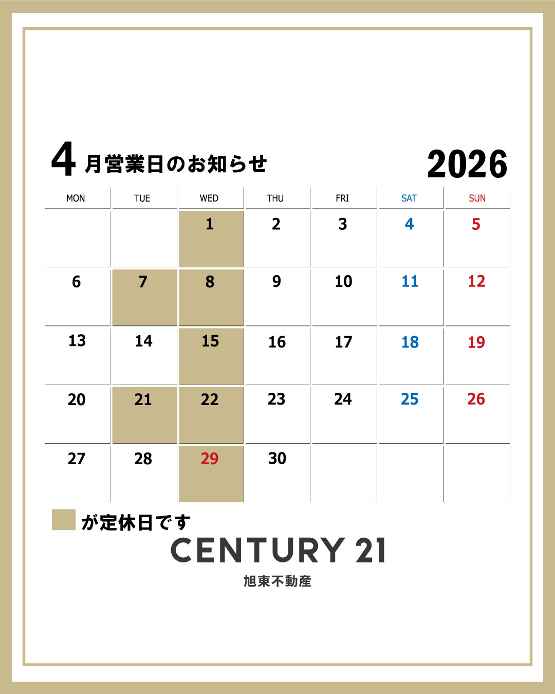 4月営業日のお知らせ【更新】4月営業日のお知らせ | 徳島の不動産のことならセンチュリー21旭東不動産